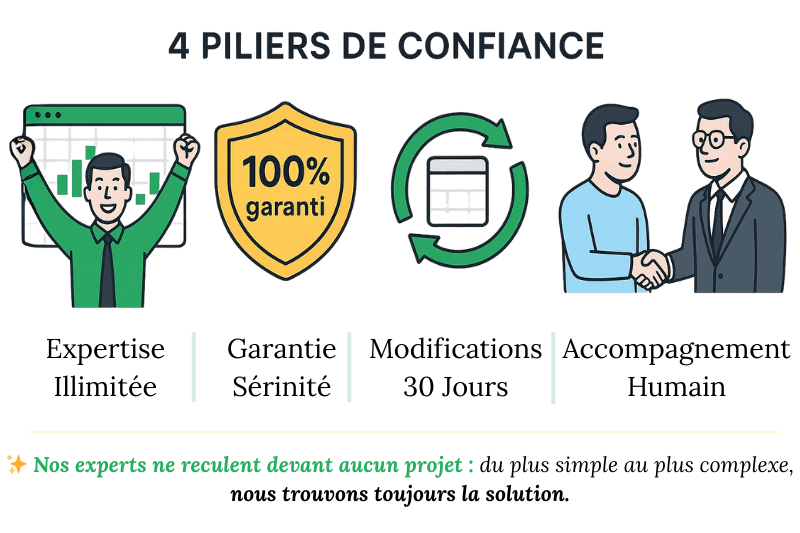 Comme des dizaines d’entrepreneurs, demandez votre fichier Excel sur-mesure dès aujourd’hui. Pas d’abonnement, pas de perte de temps. Juste une solution qui travaille pour vous.
